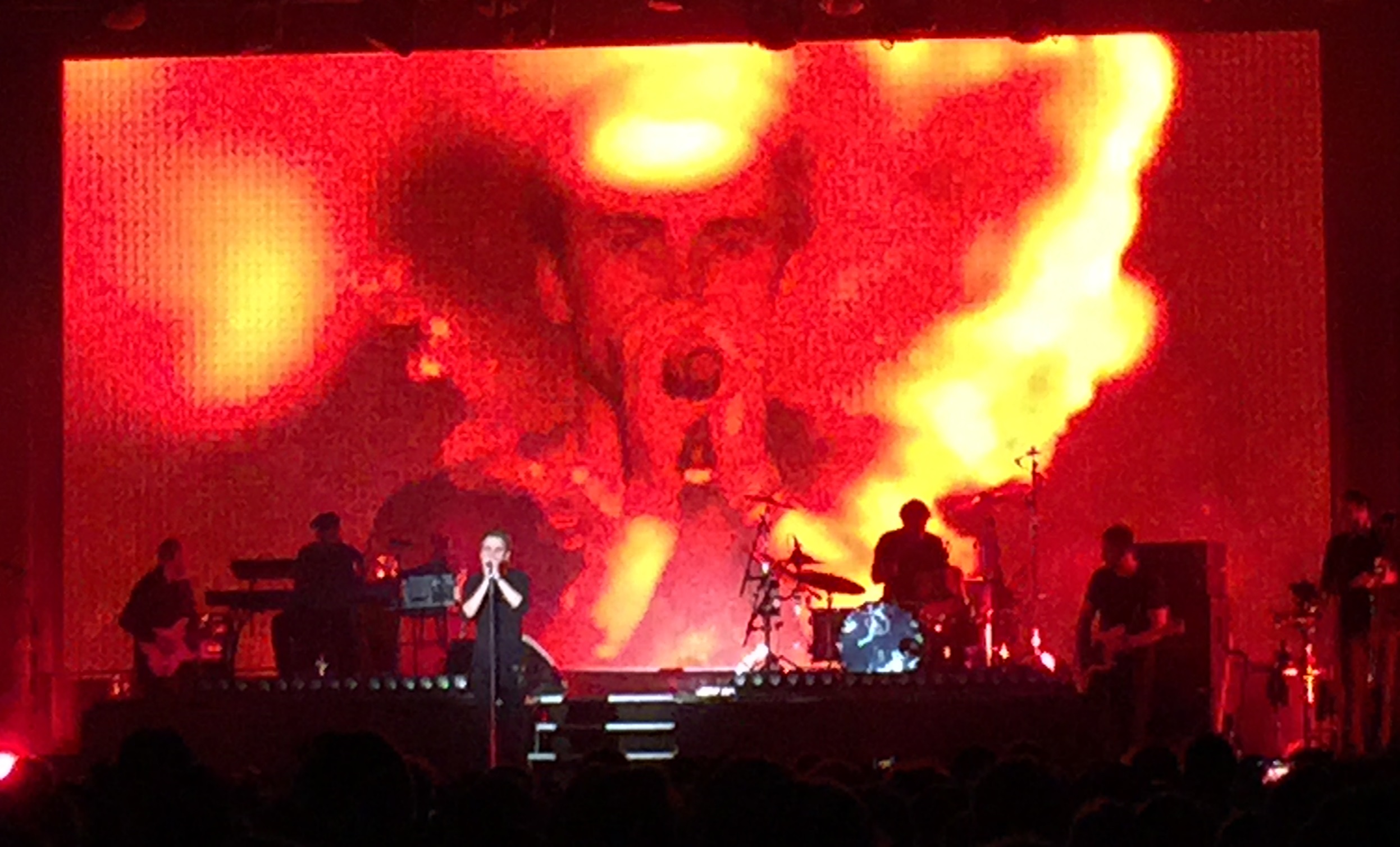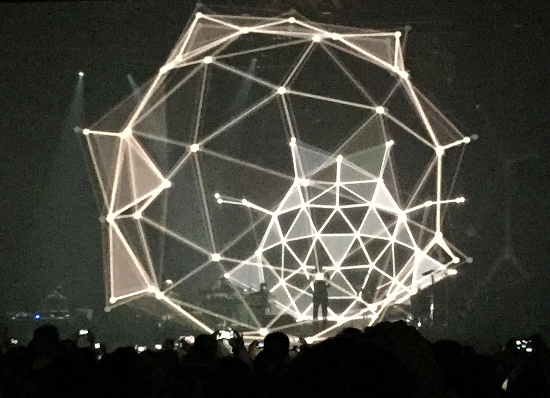 ein paar Minuten applaudierten die Fans und ließen nicht locker als plötzlich ein kräftiger Bassbeat einsetzte und das elektronisch arrangierte ‘Out Of Space’ begann, das gleichzeitig, wo eingangs erwähnt, einen bemerkenswerten dreidimensionalen Effekt erzeugte. Stand doch Clueso abwechselnd in einem Polygon oder einem, aus hunderten Verbindungen geformten, Kreis.