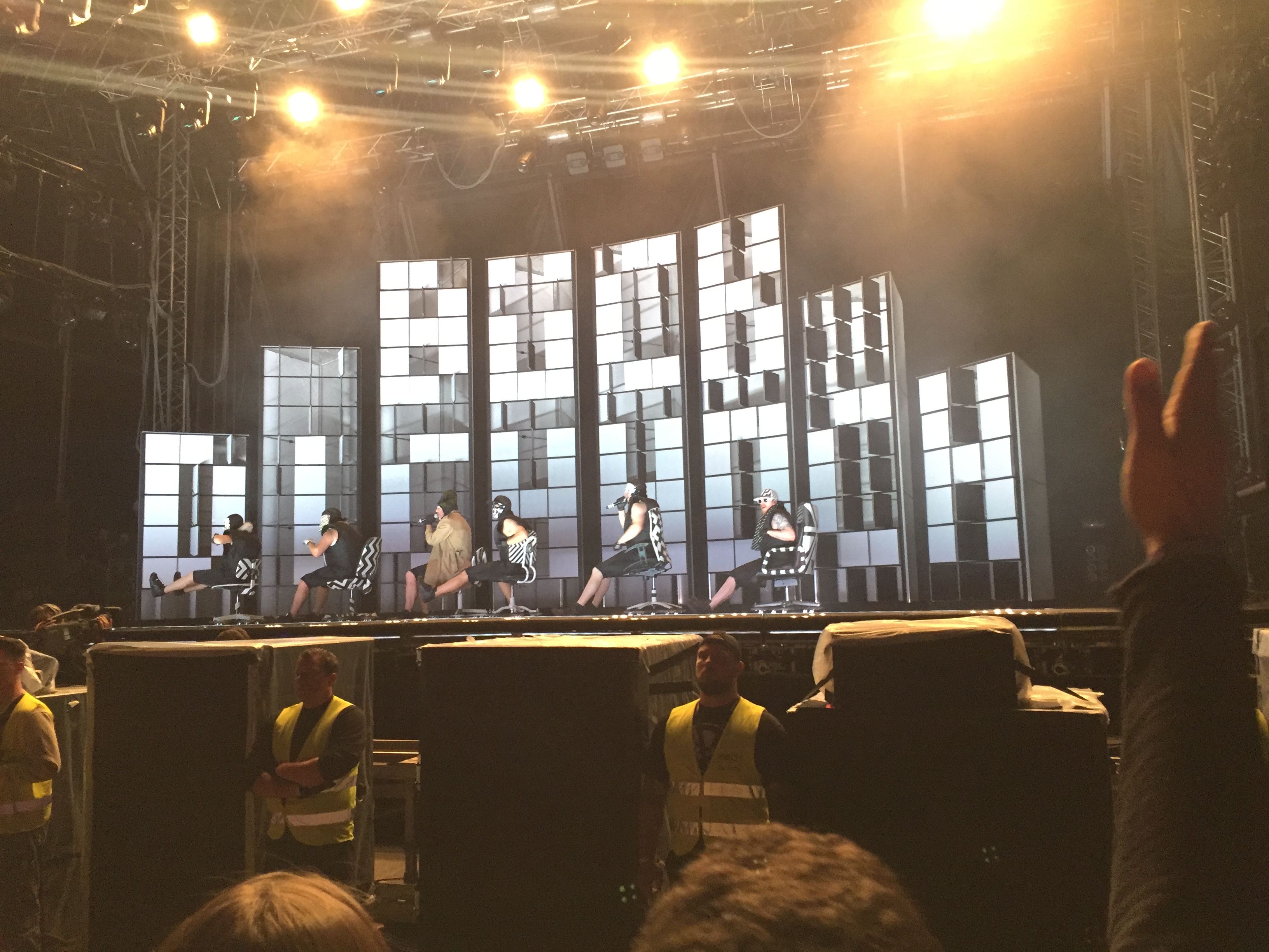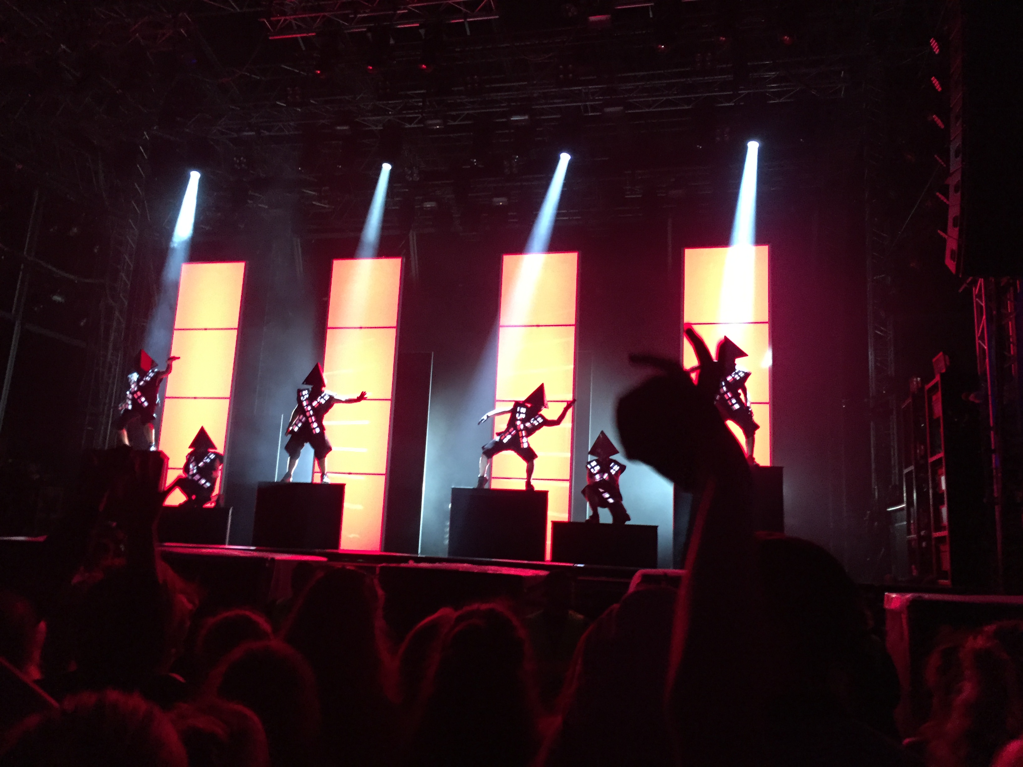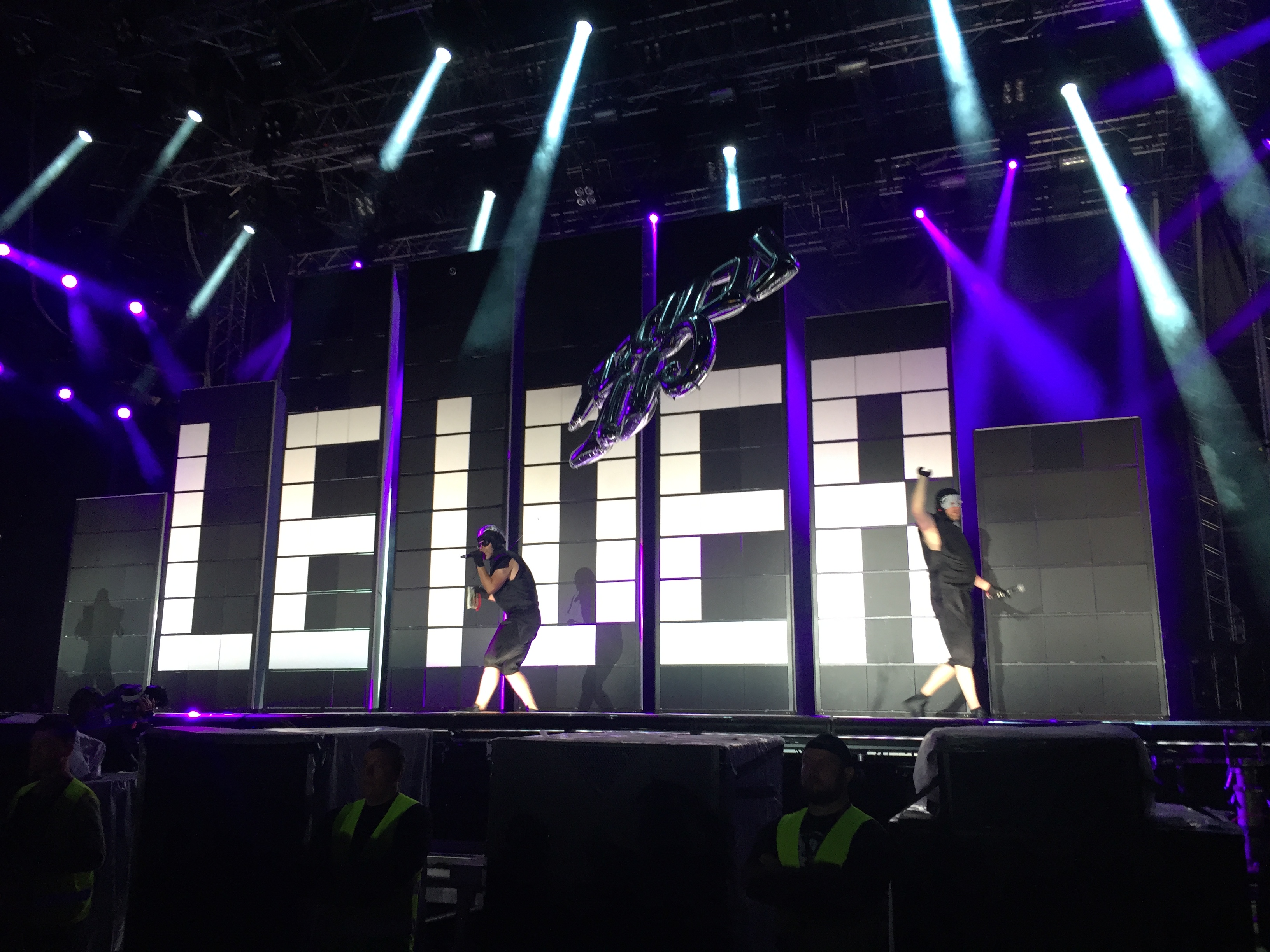 Die Uhr zeigt 23:45 Uhr an – es wurde also Zeit für den wohl besten Auftritt des Abends. Waren doch Deichkind angekündigt. Wer bereits einige Jahre MELT!-Besucher ist, kann sich vielleicht an den legendären 2006er Auftritt der Combo erinnern. Den MELT!-Veranstaltern steckt dieser Auftritt wohl heute noch in den Knochen. Hatten Deichkind doch im letzten Song, Remmidemmi (Yippie Yippie Yeah), welches um halb sieben Uhr in der früh gespielt wurde, alle Fans auf die Bühne gerufen und so für den absoluten Sicherheitsgau gesorgt. So bestiegen hunderte Fans die Bühne, drückten sich an Security’s vorbei und sorgten dafür, dass nicht nur der Strom ausfiel, sondern auch ernsthafte Gefahr bestand, dass die Bühnenkonstruktion zusammenbricht. So war es nicht verwunderlich, dass es sage und schreibe 10 Jahre gedauert hat, bis man Deichkind wieder auf einer MELT! Bühne zu sehen bekam – sicherlich auch mit strengen Auflagen. War 2006 der totale Abriss als Konzept geplant, könnte man das 2016er Konzept mit viel Pomp und Anarchie beschreiben. So gab es Wodkaduschen, Schlauchbote über den Köpfen des Publikums, Federn und jede Menge Konfetti. Deichkind sind schon lange nicht mehr die unprofessionelle Band, die mit Mülltüten auf der Bühne für absolutes Ausrasten stand. 2016 sind die Shows durchgestylt, mit Boygroup-Synchron-Performances und ganz viel Lichttechnik versehen. Da gab es Kostüme, die an Daft Punk erinnerten, Technik, die bei Kylie Minogue nicht besser passen könnte und einer Band, die den absoluten Exzess seit knapp 20 Jahren lebt. Mit diesem Performancekonzept wäre es dann auch nur zu verständlich gewesen, wenn keine weitere Band mehr die Bühne betreten hätte – kamen doch große Probleme auf, die ganzen Federn wegzubekommen. Von den Songs stachen vor allem Bück Dich hoch, Leider Geil, Remmidemmi (Yippie Yippie Yeah) und Roll das Fass rein hervor. Bei letzterem wurde, wie schon auf dem letztjährigen Lollapalooza Festival, ein riesiges Fass in die Menge gerollt, auf dem Deichkind den Song sangen. Mit jeder Menge politischer Messages versehen, nutzten Deichkind nicht nur einmal die Gunst so viele zu erreichen. Anderthalb Stunden, 90 Minuten, von 23:45 Uhr bis 1:20 Uhr, ging das Konzert und beanspruchte die komplette Energie der Fans.