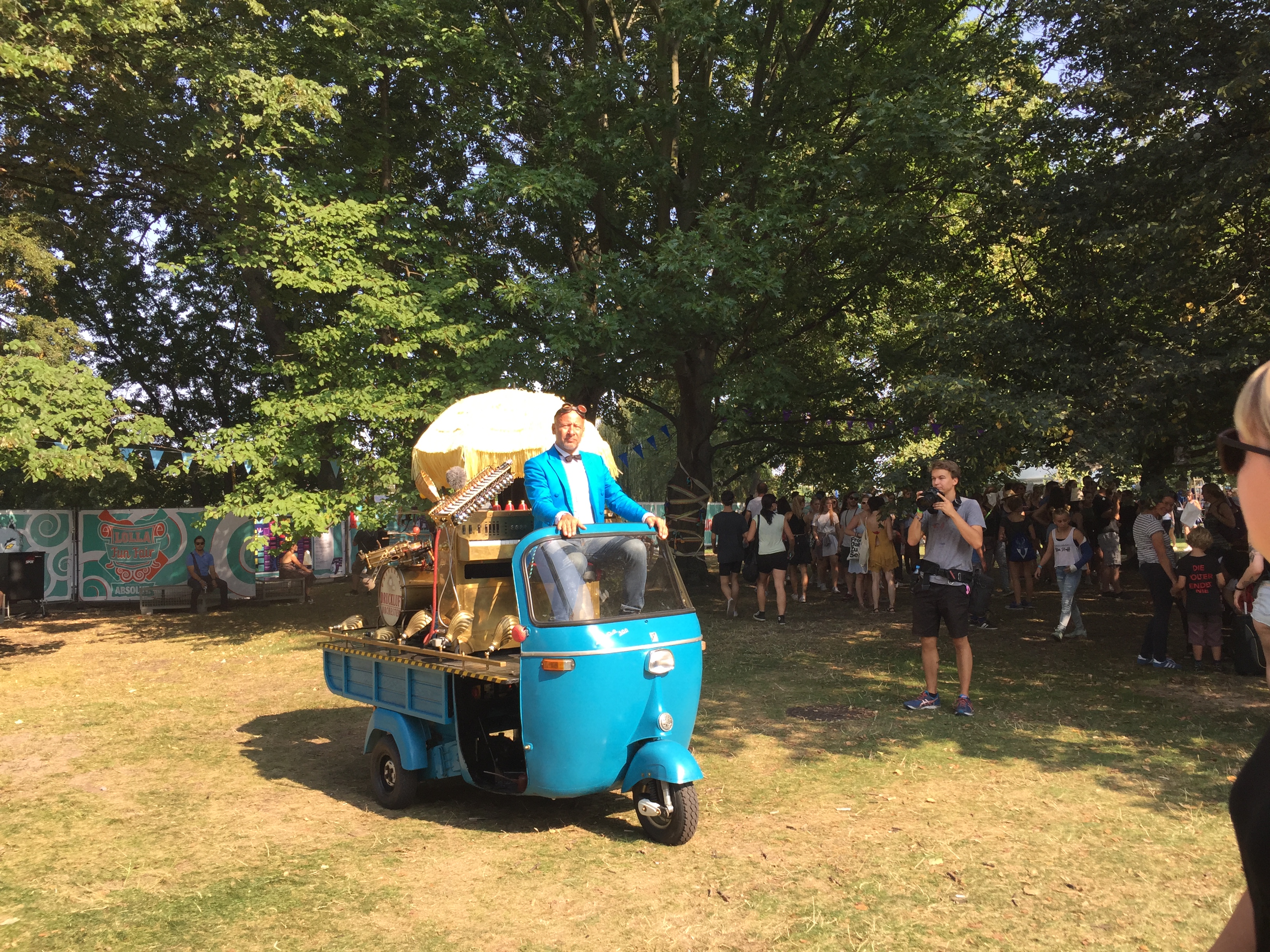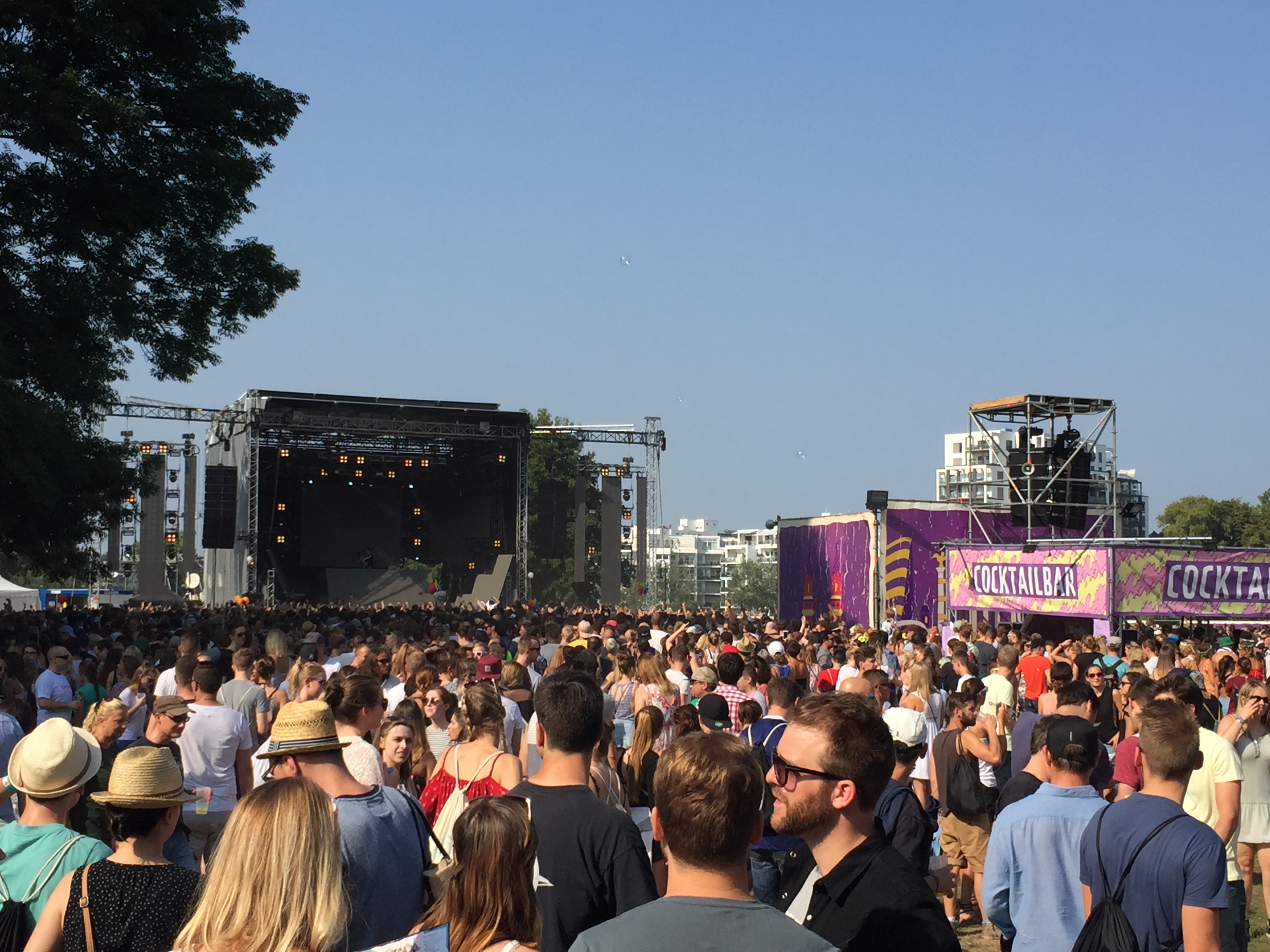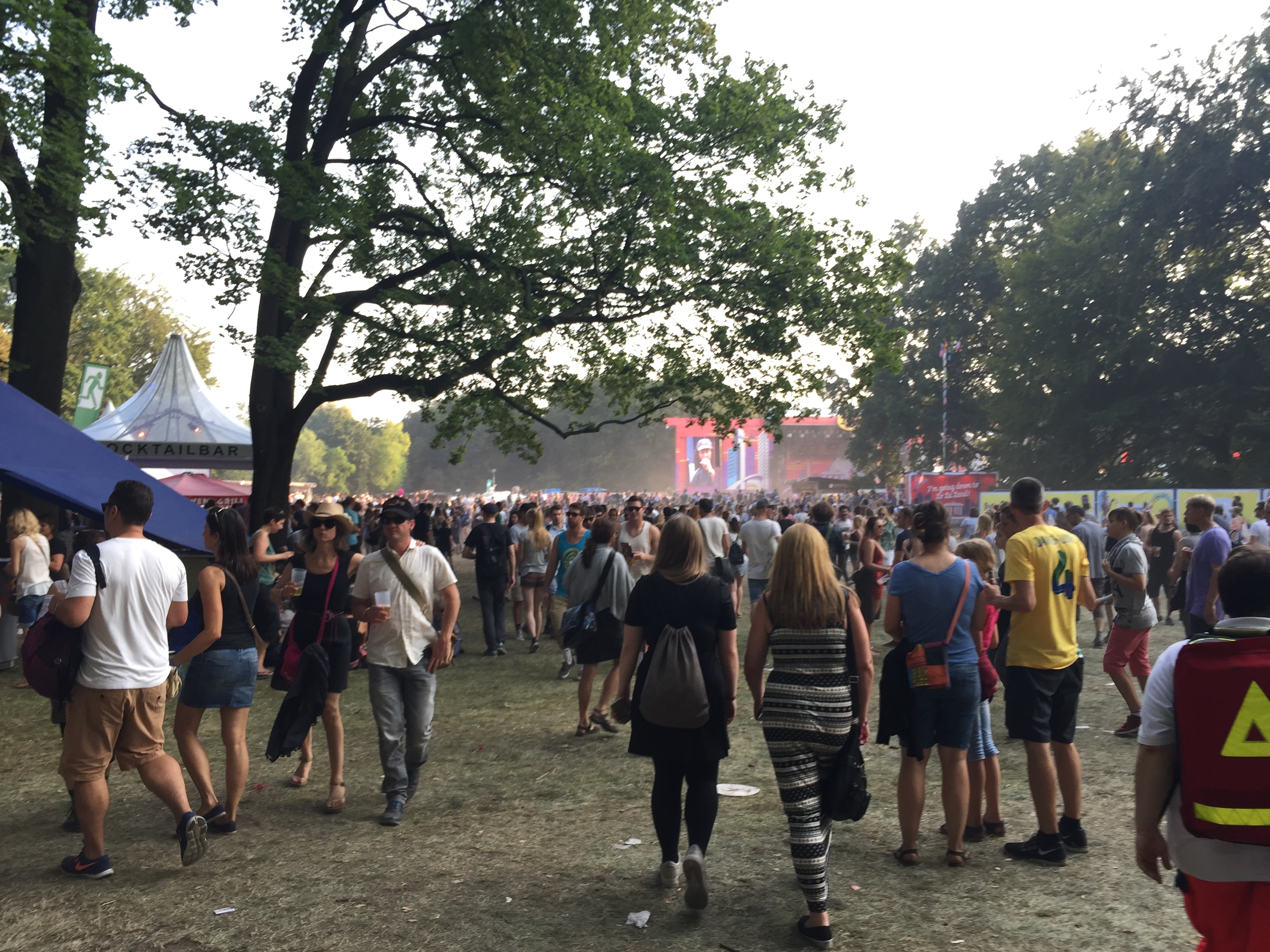 Wer den Treptower Park kennt, weiß, dass der Park so einige verzauberte Ecken hat. So kam dazu, dass die Veranstalter des Lollapalooza’s überall, ob der vielen Bühnen, Getränke- und Imbissstände, kleine Entdeckerinseln schufen. Da konnte man sich kostenlos Fotos in einer Fotobox erstellen, in einem Zirkus seinen Kopf durch Schablonen stecken und so Bilder als Dompteur oder Rad fahrender Bär machen. Aber boten natürlich auch die Sponsoren allerlei Unterhaltsames an ihren Ständen an. Mit einem Pop-up Club der ganz besonderen Art, sorgte hier eine Zigarettenmarke für viel Aufsehen. War der Club doch voll mit Technik und neuesten Hightech-Equipment. Da konnte man mit Virtual Reality Brillen in eine digitale Wüste eintauchen oder harte Drum’n’Bass Beats mit seiner bloßen Hand in der Luft erzeugen. Dies alles wurde von einem spacigen Design abgerundet.