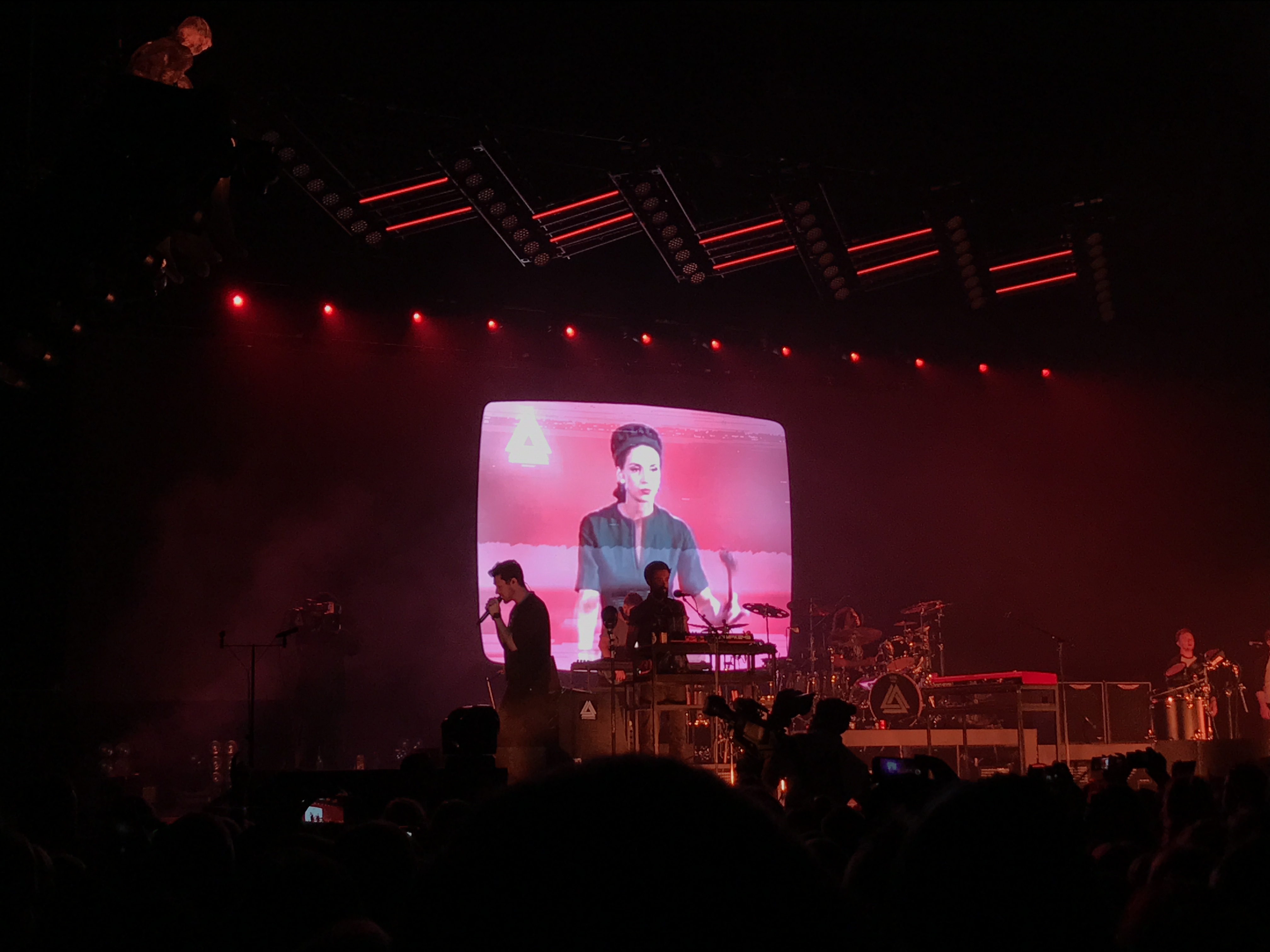Nach der Rückkehr auf die Bühne folgte mit Oblivion der, laut Smith‘ Aussage, melancholischste Song, den Bastille an diesem Abend spielen würden. Und so folgten wieder Kamerablitze und erhellten die Halle einzig durch das kleine Licht abertausender LED’s. Mit Lethargy, Things We Lost In The Fire und The Draw folgten schließlich drei Songs, die laut und eingängig waren, ehe der Anchorman mit seiner Nachrichtensendung wieder on air ging und Bastilles The Currents ankündigte. Hier kam der volle Sound der Band erst richtig zur Geltung und drückte eine Art Bedrohung aus. Ebenso ging es mit Power und Bad Blood weiter, bei denen die Fans mit ihren Händen das Markenzeichen der Band – ein Dreieck, bildeten und der Bühne entgegen streckten. Doch erst jetzt sollte der eigentlich ruhigste Song des Abends kommen. Folgte mit Four Walls (The Ballad Of Perry Smith) doch eine ruhige, tiefe und intensive Ballade.