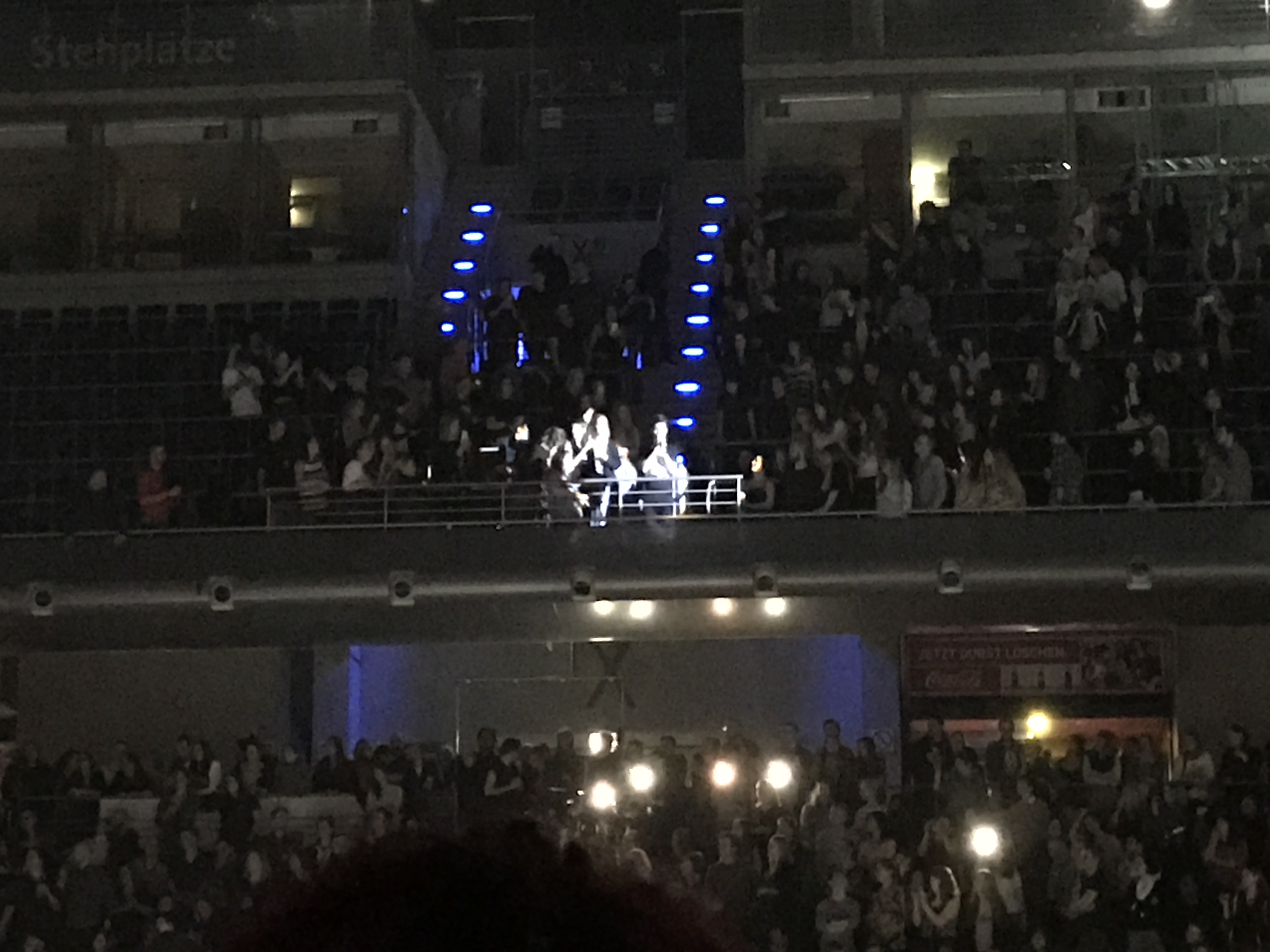 Wurde Rationale bereits von einem überspitzten Nachrichtensprecher angekündigt, kam dieser nun wieder zu Wort um Bastille willkommen zu heißen. Und so folgte ein Einmarsch unter tosendem Applaus der musikalisch mit Send Them Off! – ihrer aktuellen Single, begann. Auf großen Displays hinter der Bühne konnte man die Musikvideos sehen und gleichzeitig auch immer wieder Liveaufnahmen der Band selbst. Sollten Bastille tatsächlich all die Kameras und Techniker dabei haben, ohne einen Live-Mittschnitt des Konzertes aufnehmen zu wollen? Die Antwort bleiben sie uns bisher schuldig. Allerdings überzeugten sie gleich zu Beginn mit allerhand Hymnen und schnellen Songs. Da blieben Laura Palmer, Warmth, Snake und Flaws keine Ausnahme. Was allerdings schnell klar wurde, war die Textsicherheit der Fans. Sangen sie doch so inbrünstig und sicher mit, dass manchmal sogar der Schall von der Decke das Konzert anführte. Überhaupt gab das Dach mit seinen Glasplatten eine wunderschöne Kulisse ab, wenn die Handyblitze gezückt wurden und so ein Sternenmeer entstand. Als sich dann allerdings Frontsänger Dan Smith in Richtung Publikum auf den Weg machte, erhellte ein Kreischen der Menge die Halle und ließ den Sound dutzender Boxen fast verstummen. Nah, freundlich und direkt – das konnte man Smith nachsagen und so marschierte er bis ans Ende der Halle und stattete den Fans auf den Rängen einen Besuch ab.