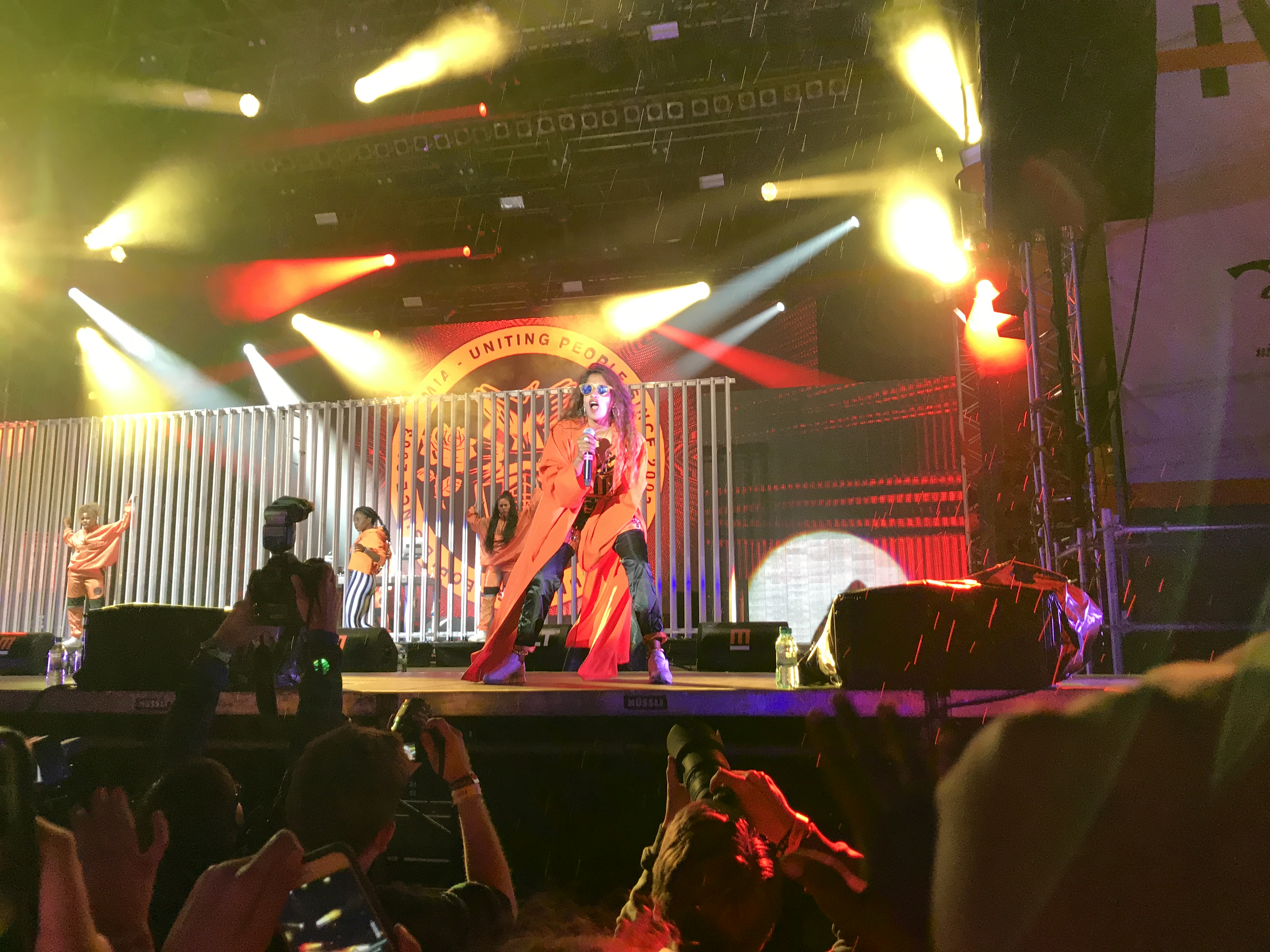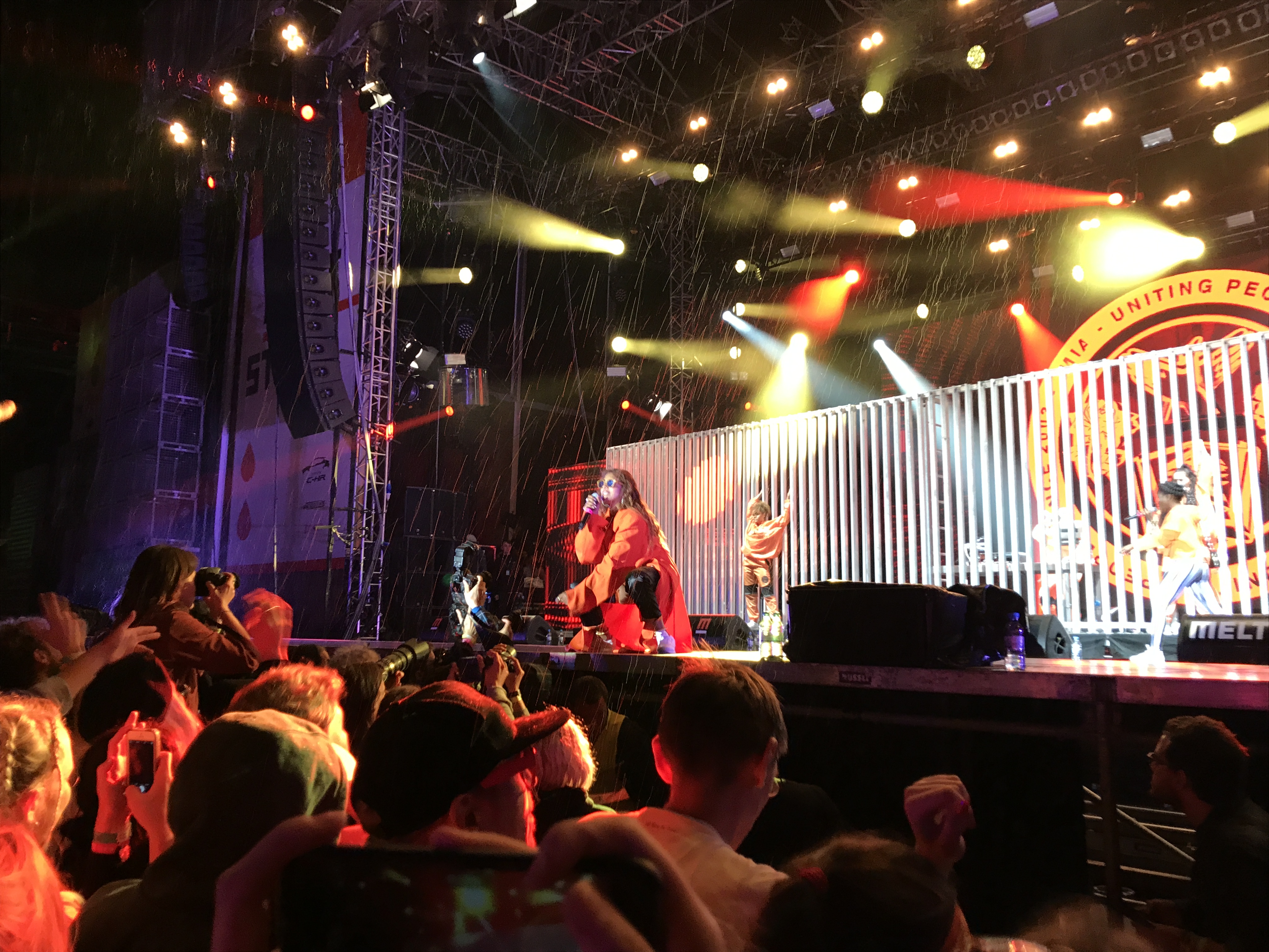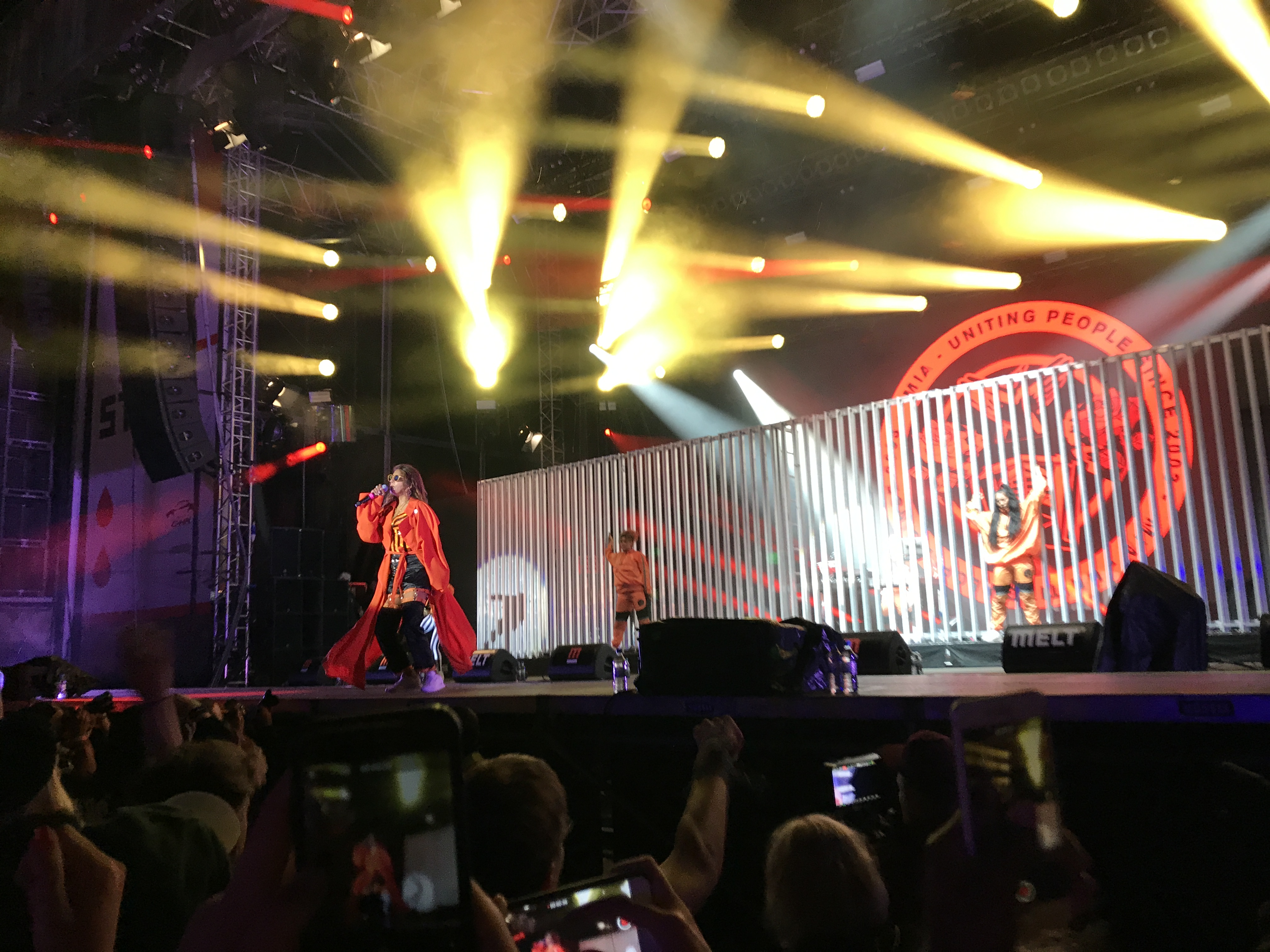 Gegen 23:30 Uhr kündigte sich dann einer der Hauptacts des Wochenendes an und blies mit satten Bässen alles aus einem heraus. M.I.A. war schließlich keine normale Künstlerin – und was ist auf dem MELT! Festival schon ein normaler Künstler?! Die Britin sorgte mit ihrem Mix aus experimentellen Dance, Rap, Pop und einem nicht zu verachtenden Anteil Weltmusik für eine wahre Soundexplosion bei der die Lunge und das Trommelfell auf eine harte Probe gestellt wurden. Schließlich sollten Songs wie Borders, Pull Up The People, 20 Dollar und Bad Girls passend präsentiert werden. Im rot-schwarzen Gewand, einer bühnengroßen Leuchtstoffröhrenwand und einem DJ dahinter, machte sich M.I.A. die ganze Bühne zu eigen und scheute auch nicht davor zurück, im Platzregen auf den Bühnenvorbau zu gehen und mit dem Publikum zu performen. Als es dann allerdings so stark anfing zu regnen, dass man sich ohne Poncho zwischen triefenden Klamotten und einer halbtrockenen Verlängerung des Abends entscheiden musste, gewann die Verlängerung und die Hälfte des Publikums machte sich auf, irgendwo einen trockenen Platz zu finden. Zum großen Finale kamen dann allerdings alle zurück und Paper Plans zuckte mit seinen Beats und der Lichtshow durch die Nacht.