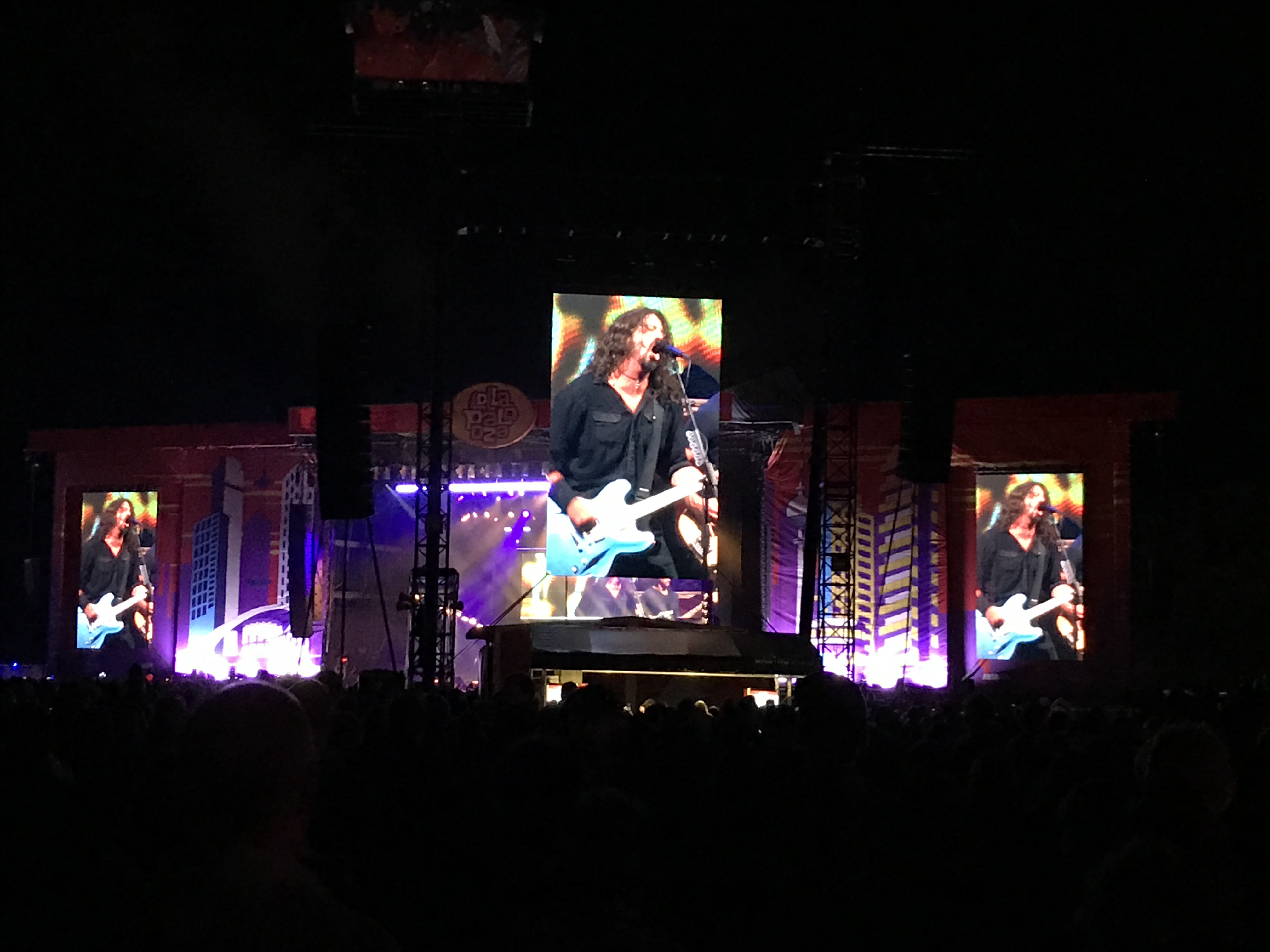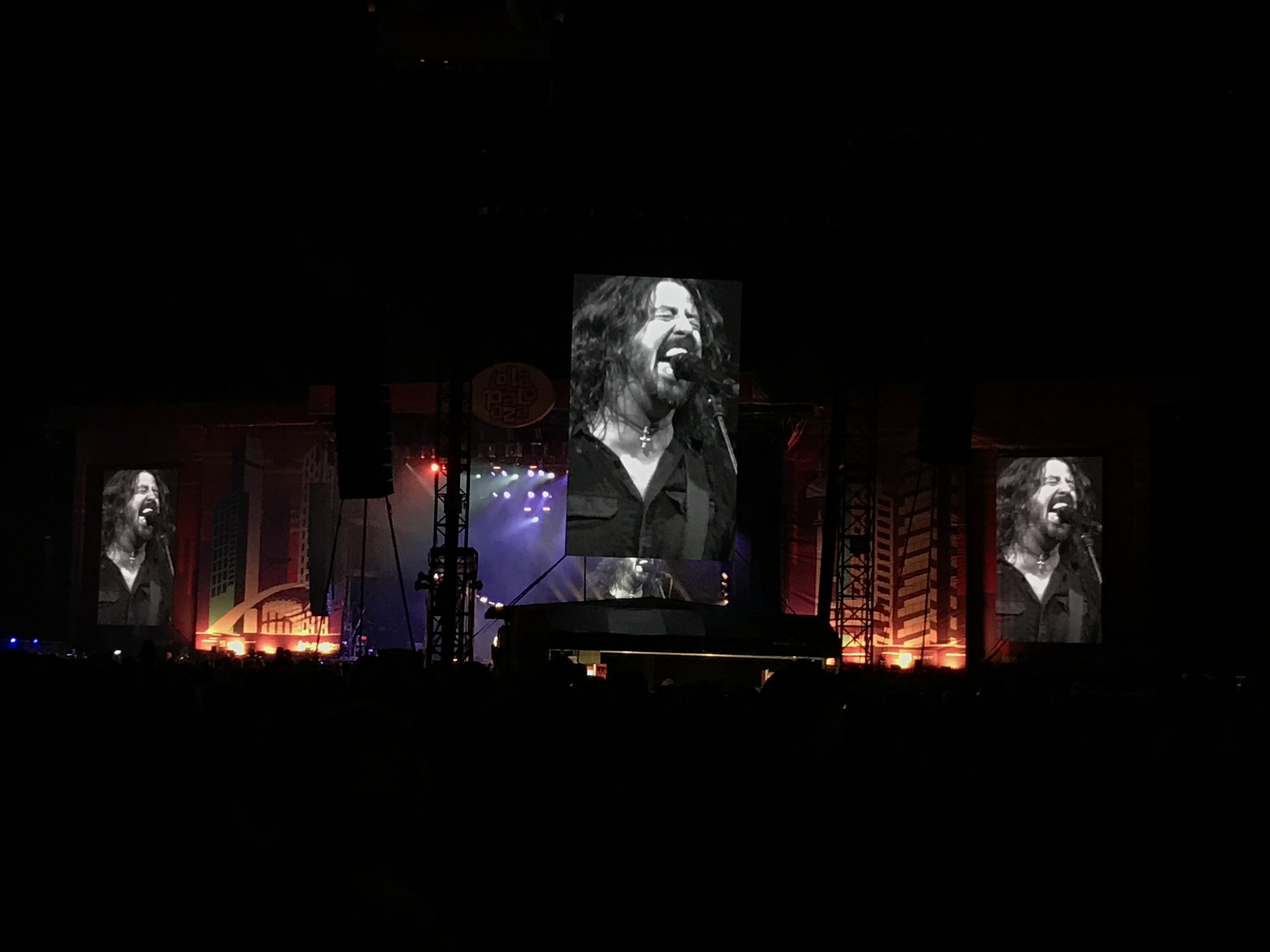 Denn auf der Mainstage wurde alles für das einzige Deutschlandkonzert der Foo Fighters aufgebaut. Bereits lange vorher war das Vorfeld der Bühne von tausenden Fans okkupiert worden. Machte man sich nun also 20 Minuten vor Beginn des Auftritts auf zur Bühne, kam man von den Getränkeständen des hinteren Feldes nicht mehr weit. Denn bereits jetzt waren von der Bühne bis zur anderen Seite der Rennbahn die 350 Meter so voll, dass man sich nur noch in den hinteren Metern einreihen konnte. Mit aufblitzenden Showlicht, kam dann auch Dave Grohl auf die Bühne und ließ erstmal eine Holy Shit los, als er die Massen sah. Dies sollte ihm immer wieder über die Lippen kommen und ließ ihn dadurch oftmals irgendwo zwischen vermeintlich aufgesetzt und fasziniert wirken. Mit sagenhaften 21 Songs wurde der Auftritt eine kleine Entschädigung für die Tatsache, dass es trotz neuem Albums, vorerst keine weiteren Konzerte in Deutschland geben sollte. Und so spielte sich die Band um Grohl durch alle bekannten und beliebten Songs der letzten 22 Jahre. Ob Learn To Fly, The Pretender, My Hero, Walk, Rope, Best Of You oder Wheels war alles dabei, um Dave Grohl und das Publikum ausrasten zu lassen. So schrie er nicht nur einmal Hey ins Mikrofon um beim fünften mal amüsiert hinzuzufügen, dass es nicht seine Stimme am Ende sein wird, die weg sei. Auch die Foo Fighters hatten den ein oder anderen Gastkünstler mit auf der Bühne. So war zum Song The Sky Is A Neighborhood die Sängerin Taylor Greenwood mit auf der Bühne, als auch zum Jane’s Addiction Song Mountain Song kein geringerer als Jane’s Addiction Frontman und Erfinder des Lollapalooza Festivals Perry Farrell selbst dazu stieß. Die Foo Fighters spielten ausgiebig, laut und hatten sogar ihre rebellische Ader ausgelebt, in dem sie immer wieder erwähnten, dass sie ein Verbot erhielten, länger als angekündigt zu spielen, da sich sonst jemand beschweren könnte, es aber dennoch versuchen wollen.